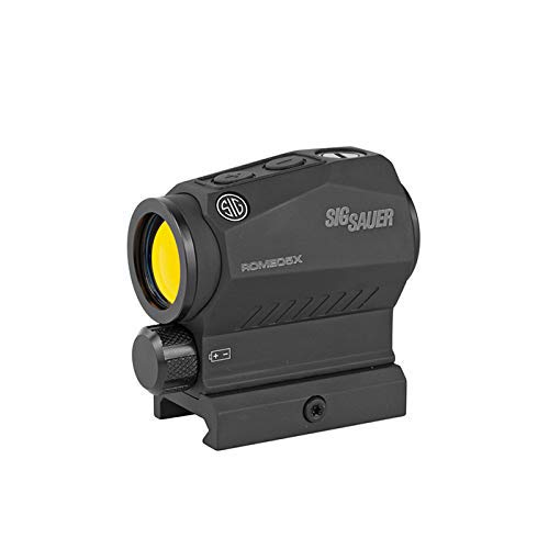 High performance red-notch coating for excellent light transmittance and crisp red dot clarity - 2 MOA dot reticle with 10 illumination settings (8 daylight + 2 NV) - MOTAC- motion activated illumination control powers up when it senses motion and powers down when at rest. Extends LED runtime in excess of 50000 hours under normal use - 1.41 Absolute co-witness mount with a spacer to increase to 1.63 1/3 lower co-witness included - Cast from aircraft grade aluminum for ruggedness and durability - Front mounting AAA battery for easy replacement without sight removal - Dependable IPX-7 waterproof and fogproof performance - The ROMEO5 X is a compact closed red dot sight for use with modern sporting rifles carbines shotguns and air rifles. It features a crisp 2 MOA dot reticle for rapid target acquisition in any situation. The sight comes with a modular mounting system supporting either 1.41 absolute co-witness or 1.63 1/3 lower co-witness sight height and attaching with a Torx cross-bolt mount. The ROMEO5 X features MOTAC and runs off a single AAA battery providing over 50000 hours of runtime during normal use. - Includes: - Mount and spacer - Bikini style lens covers - Torx installation tool - Lens cloth - AAA battery - Finish: Black - Length: 2.47 Inches - Weight: 6 Ounce - Style: Tube - Magnification: 1 - Adjustment Click Value: 1/2 MOA - Warranty: Sig Sauer Electro Optics Infinite Guarantee - Reticle: 2 MOA - Battery Type: AAA - Batteries Included: Yes - Reticle Color: Red - Housing Material: Aluminum