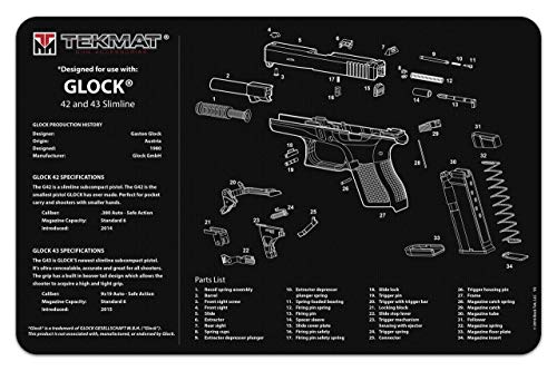 TekMat is the creator of original printed cleaning and maintenance mat. Our 17” TekMats are large enough to handle a fully disassembled handgun with room to spare for tools and accessories. The 1/8” padding on these mats not only provides a premium feel and high level of quality but it offers extra protection from any rough handling or drops while working on your firearm. The ultra soft oil and water-resistant surface helps protect your firearm from scratches while the diagrams and illustrations help with cleaning disassembly and are just plain fun to look at. - PROTECT YOUR GUN AND YOUR WORK AREA - The soft thermoplastic fiber surface ensures your gun doesn’t get scratched while the extra thick 1/8” vulcanized rubber will protect your work surface and prevent the mat from sliding. This mat will also keep harmful chemicals oil and dirt from penetrating down to your desk bench or work area where you normally clean and work on your Glock 42-43. - OVERSIZED DESIGN - This Glock 42-43 gun cleaning mat measures 11” x 17” and is 1/8” thick. The oversized design gives you plenty of room to disassemble your handgun and to clean it without having to move parts all over. The thick 1/8” vulcanized rubber backing ensures the cleaning mat will protect your firearm and work surface. - QUALITY GUN CLEANING MAT - This Glock 42-43 gun cleaning mat by TekMat is made to exacting standards. This begins with the water-resistant scratch proof fade and oil resistant dye-sublimation printing. This heat transferred printing impregnates the ink into the fibers for a lifetime of durability. TekMat does not silkscreen their designs like a lot of other inferior gun cleaning mat manufacturers. - EASY TO USE - This Glock 42-43 gun cleaning mat comes with an overview of the history of the Glock 42-43 as well as a simple to follow parts diagram of the parts that make up your Glock 42-43. The Glock 42-43 cleaning mat rolls up for easy storage along with your other cleaning supplies and accessories.