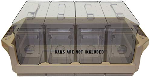 Designed for the easy transportation and storage of the hundreds of millions of US Metal Military 30 Caliber ammo cans out there. Excellent for organizing ammo tactical gear tools survival gear and easy to secure with Four tie down spots for ATV attachment. Trays are stackable and nest on to the top of each ammo can giving you the ability to stack them tall. Metal ammo cans have a tendency to rust when stored on certain floor types the tray holds them 3/8 off the floor. Ammo cans sold separately. MAC30 hold 4 30 Cal. Metal ammo cans securely in their slots and each tray will hold up to 100 lbs. Strong large handles carry the load easily and the tray are made of rugged polypropylene to last. Both sizes of the Metal Ammo Can Trays stack on top of each other. Made in the USA - Tray Outside Dimensions: 19.5” x 12.5” x 4.8” High - Tray with cans Outside Dimensions: 19.5” x 12.5” x 7.4” High
